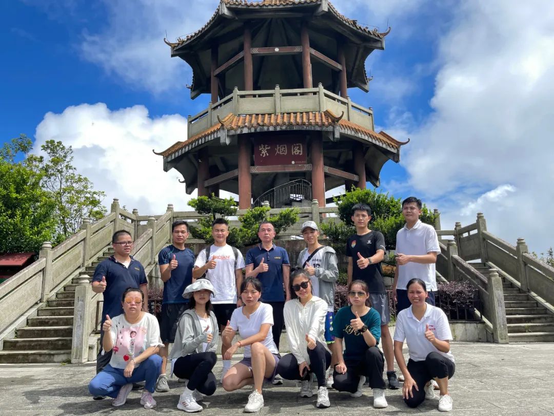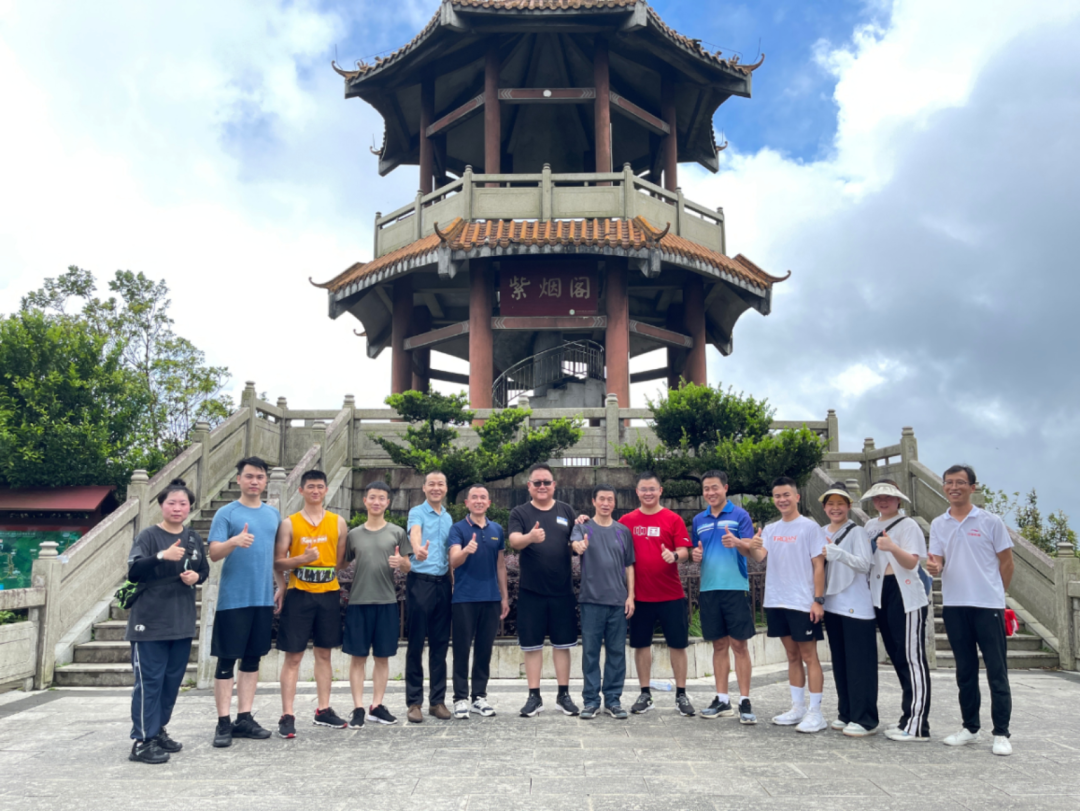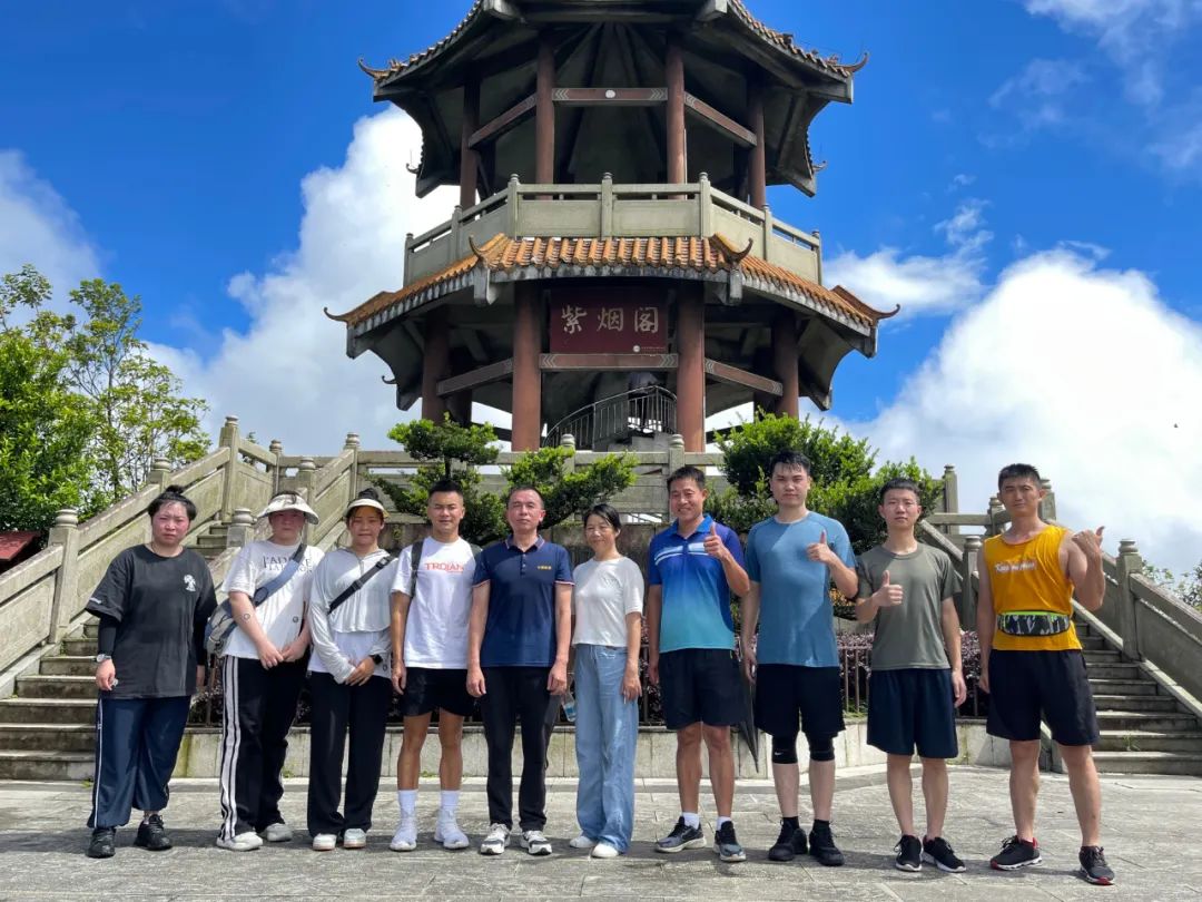 经过两个半小时的跋涉,在大家的互相帮助下,上午10点30分,此行全部成员全员登顶,无一人掉队,令人欣喜。在攀登曲折迂回的山路、攻克各种难关而登到顶峰后,那种通过付出努力终达目标的感受是无法比拟的,和白云站在一起,起风了,树木似乎都在为我们欢呼。随后,各部门自行组织了合照拍摄,欢声笑语、气氛愉悦。